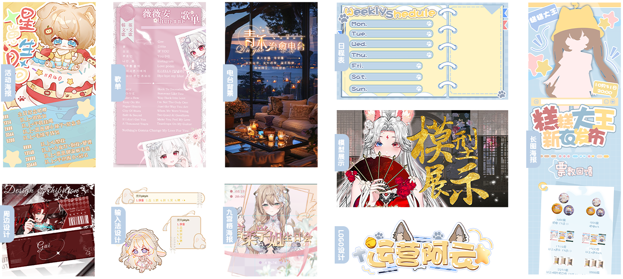包含类型:各种类型活动海报、歌单、电台背景、日程表、模型展示、各类周边设计、输入法设计、logo设计